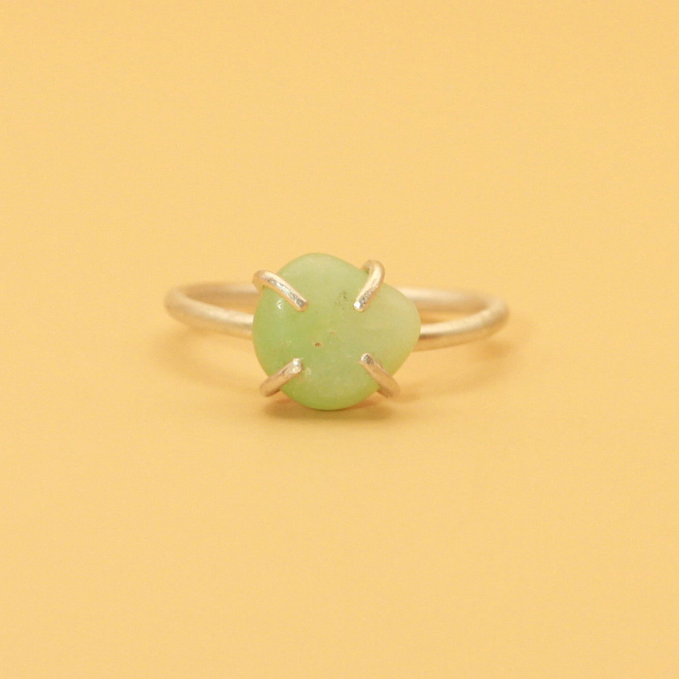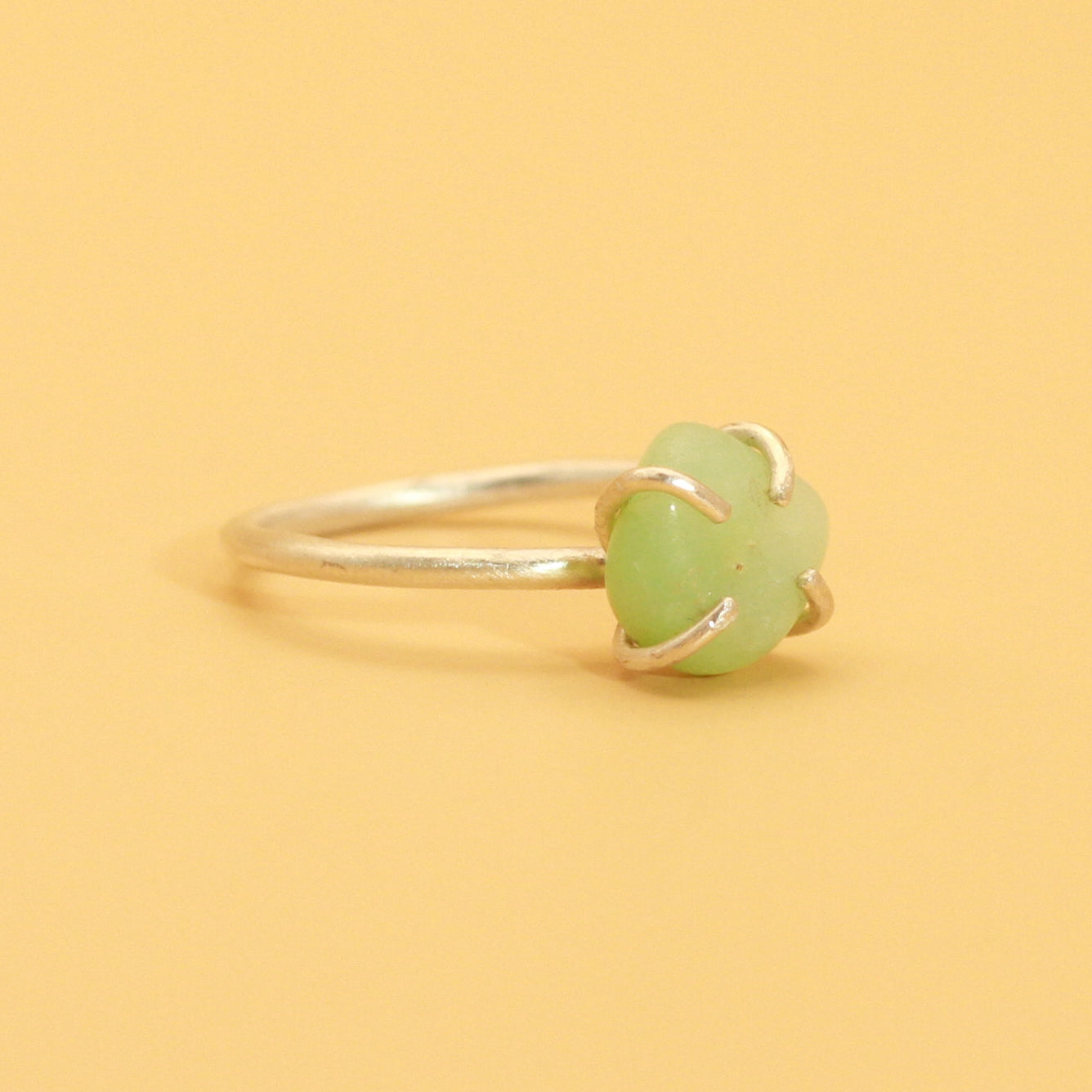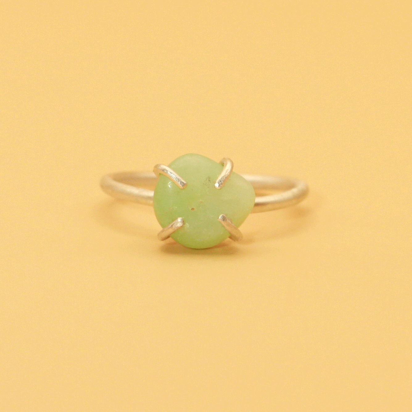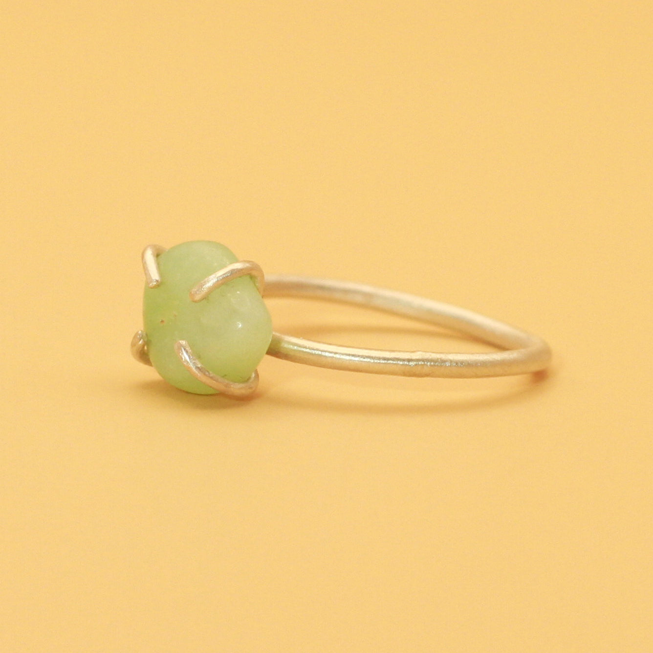 The ‘Pebbly’ ring is cut and polished by hand and set on a sterling silver (92.5%) claw ring band, which is also-you got it-made by hand!