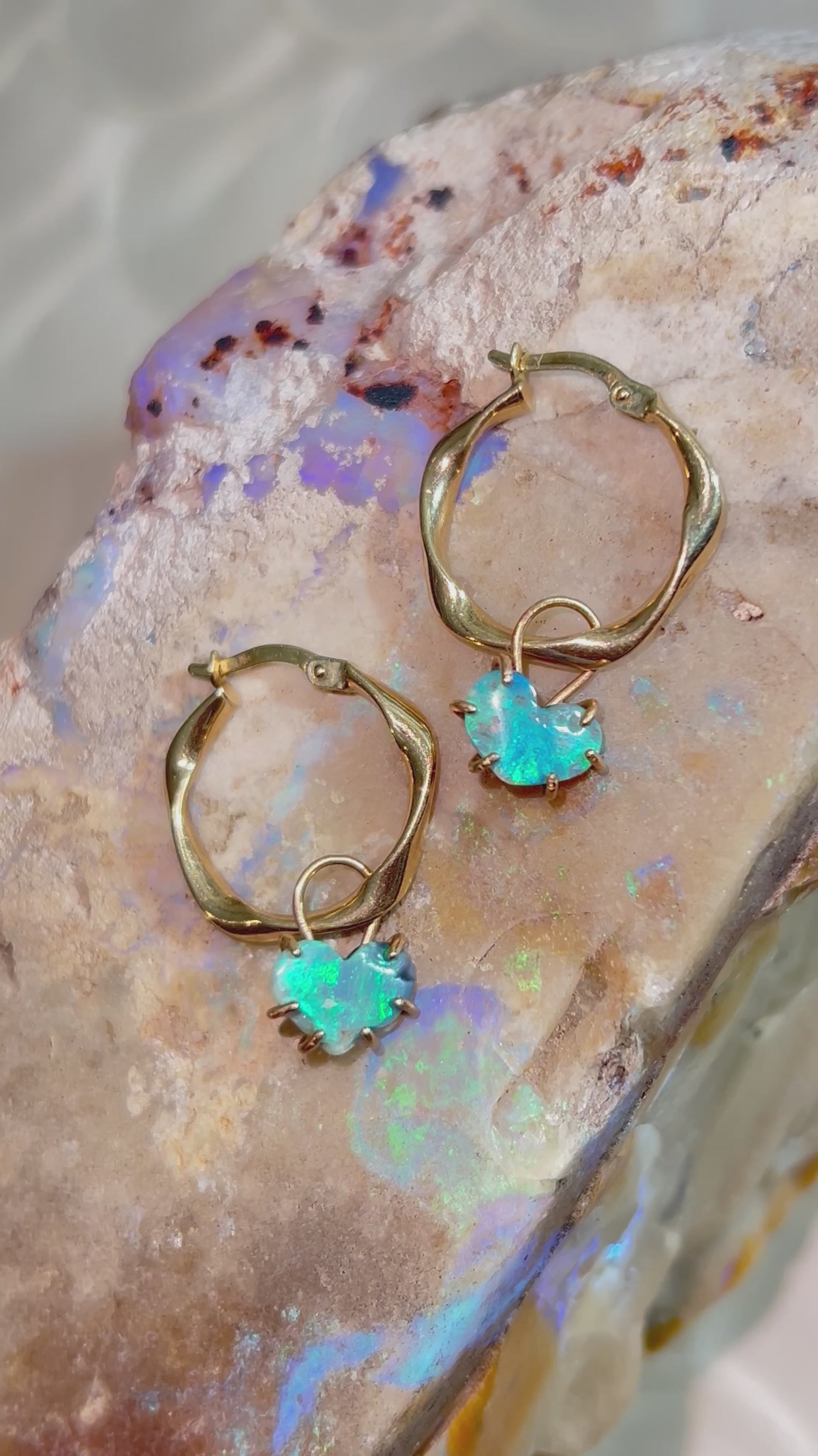 A pair of delightful vibrant Blue Opals from Lightning Ridge, Australia. Hand cut into the shapes of adorable hearts! Both are set onto Solid 9ct gold claw settings.