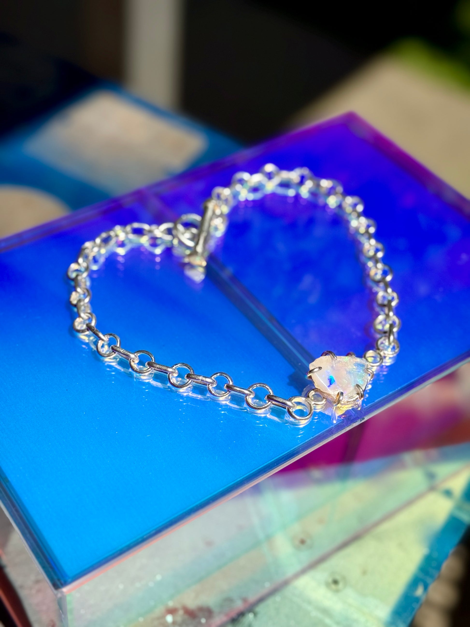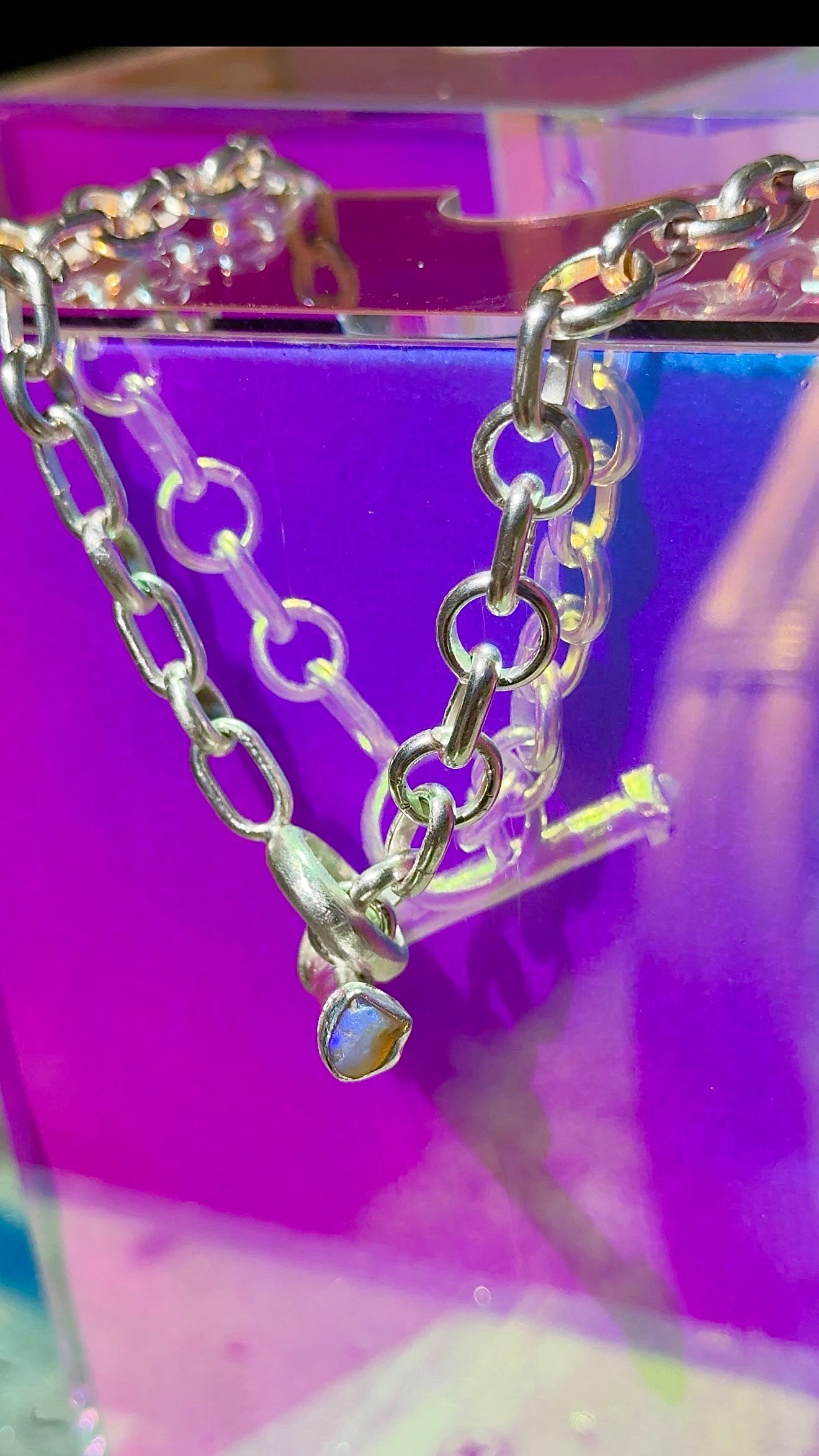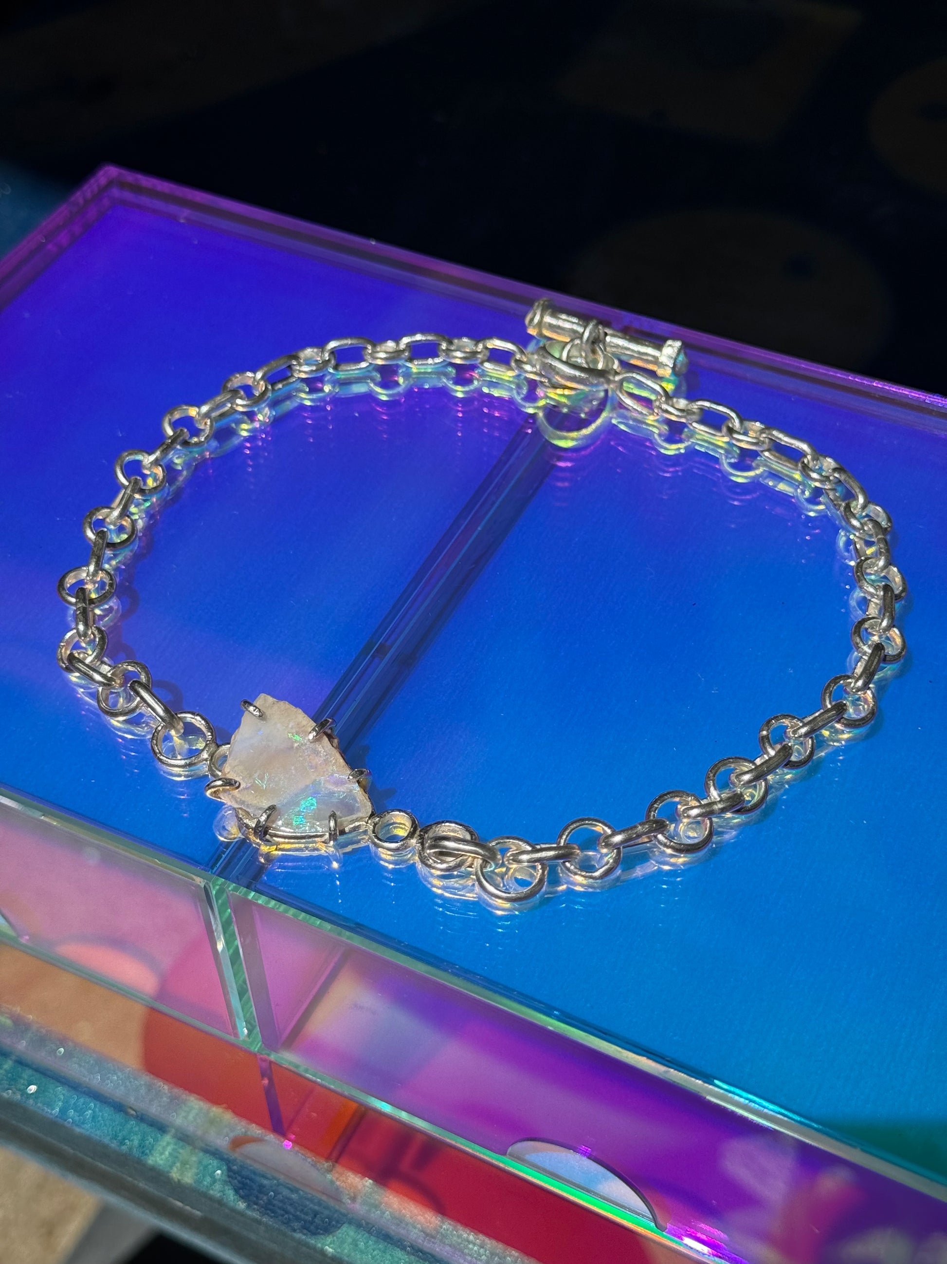 This particular chunky rough (or organic shaped) opal chain choker featured in the pictures is an exquisite hand polished, rough cut, Australian opalised shell fossil set in a handcrafted Argentium silver (940), with a 'gladiator' mini rough opal toggle clasp.