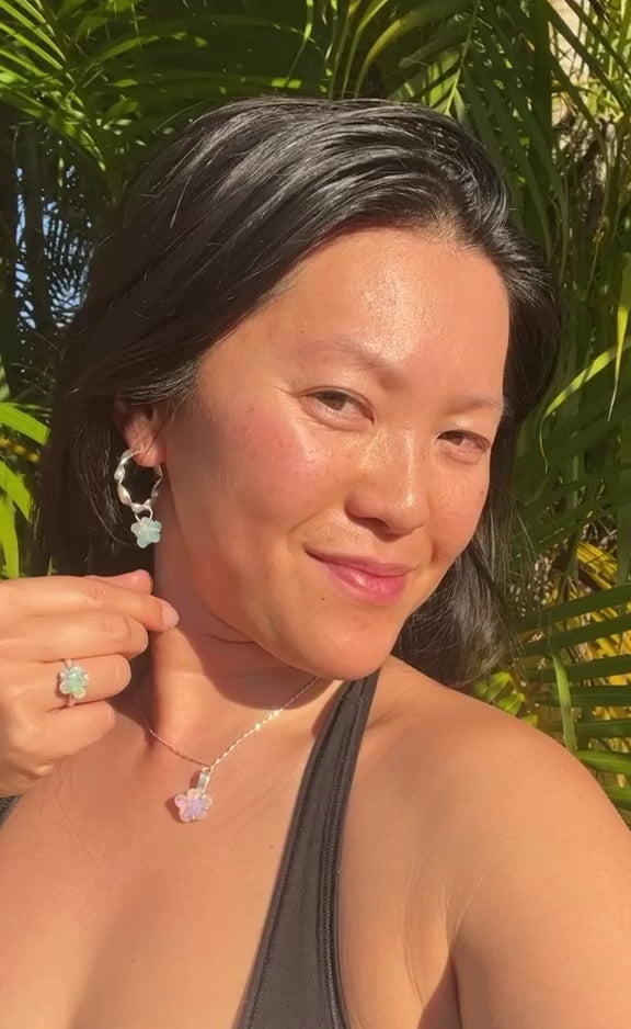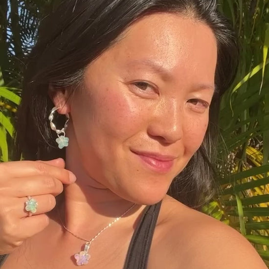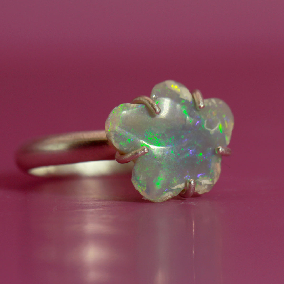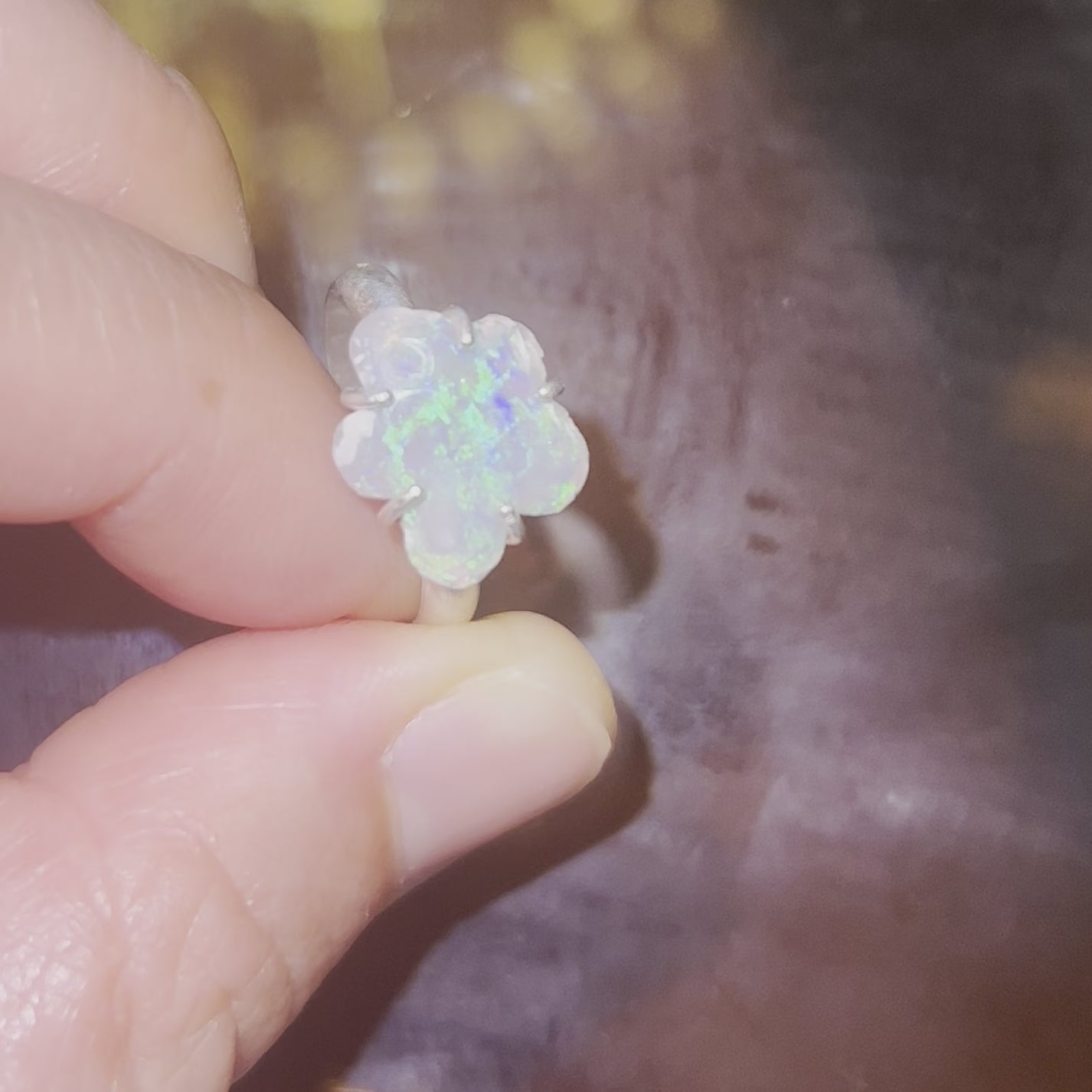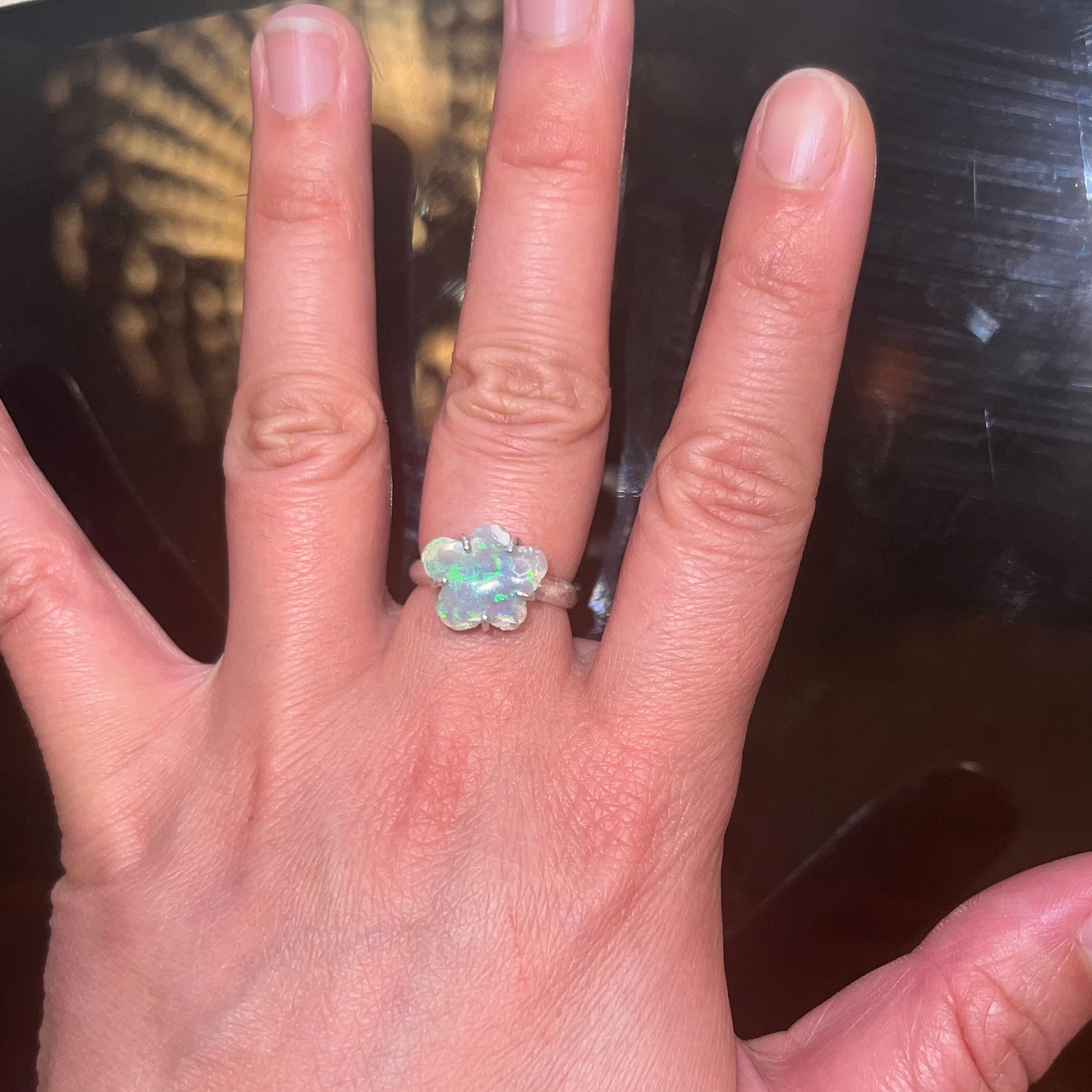 ❀🚶🏾♀️💜💚Take a walk on the wild side with ✿ The Mod Flower ✿ Green Opal Ring! Boasting a vibrant green ⚡️Lightning Ridge opal hand cut into a Mod (1960s) flower shape and set on a handmade sterling silver (925) pronged ring band.