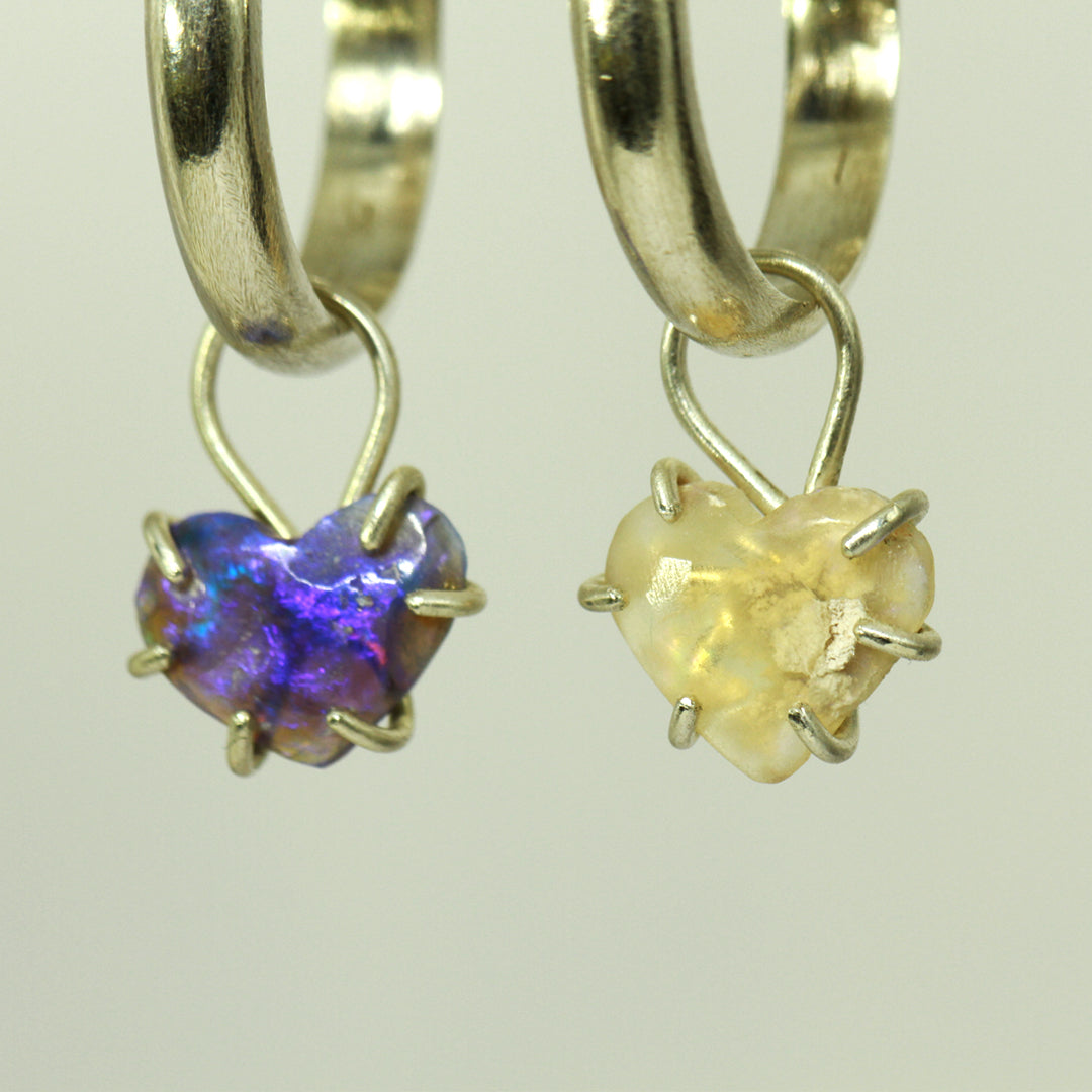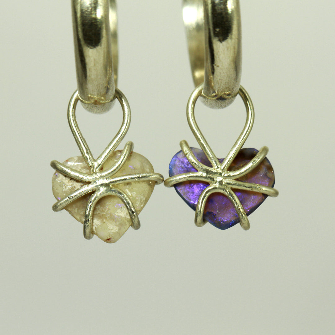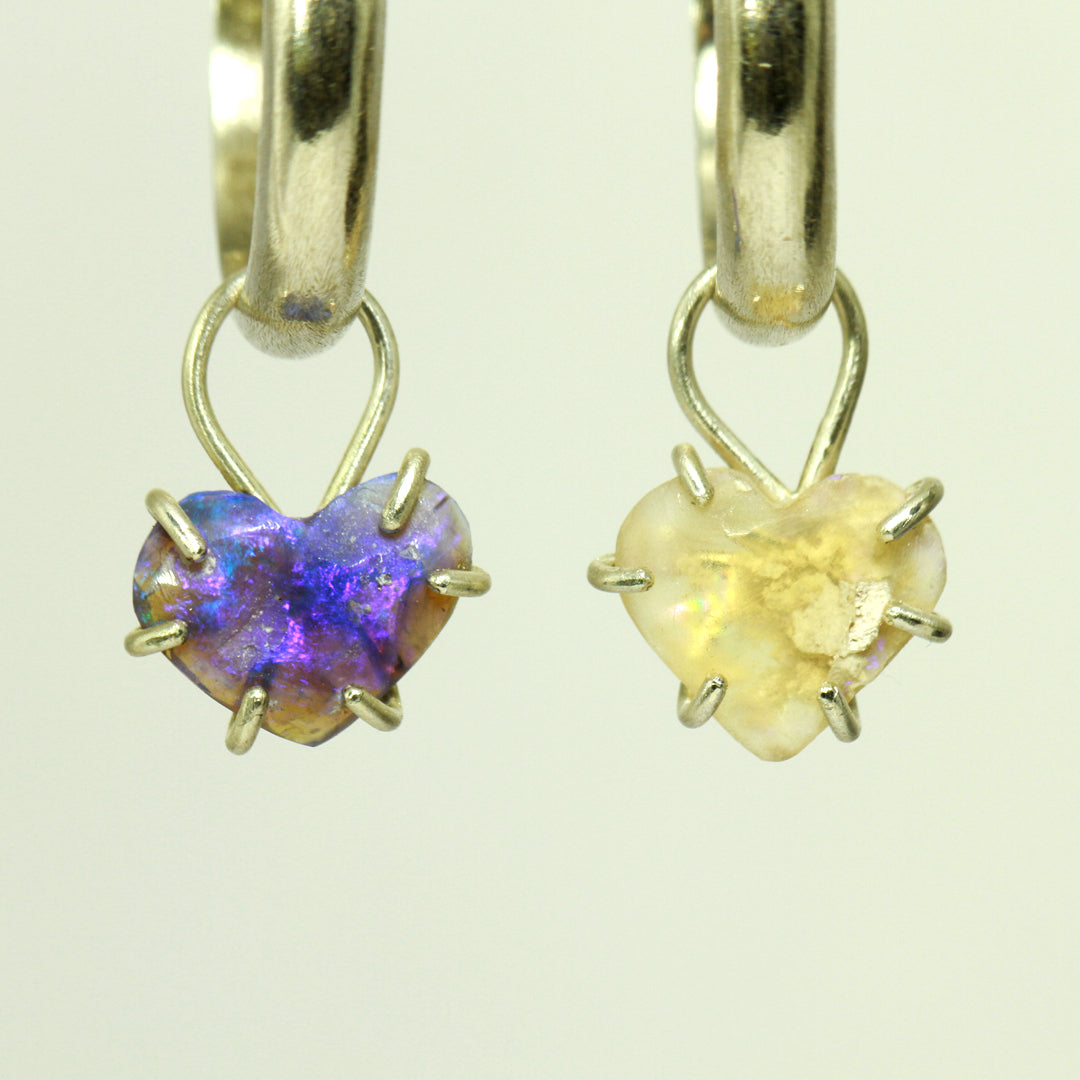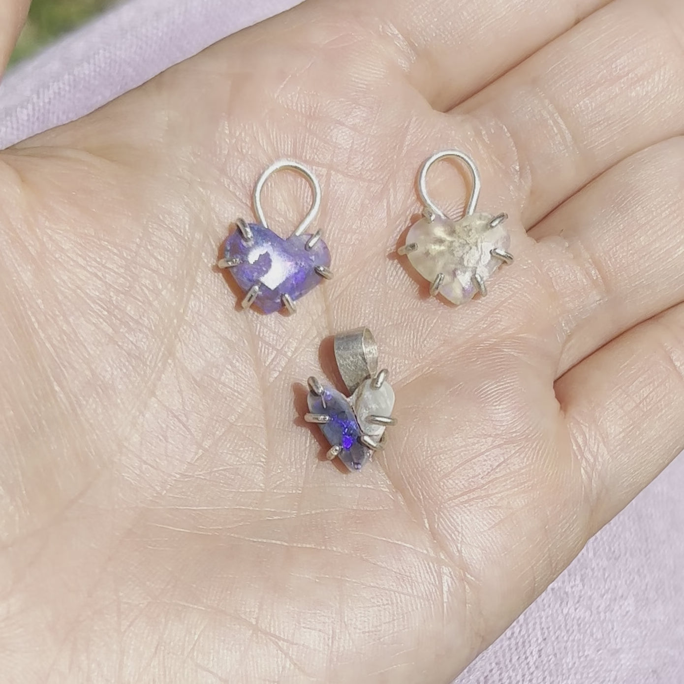✨👌🏾Hand cut and polished Lightning Ridge 💜Purple and 🤍White Crystal opals make up a pair of 💟Purple & White Love at First Sight hearts earring charms💟✨💍 Set on specially handcrafted pronged charm settings made uniquely for the pair.
