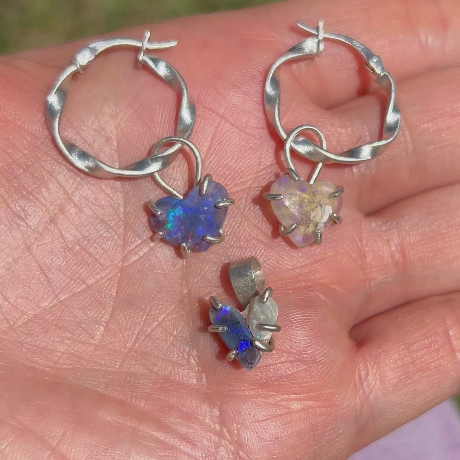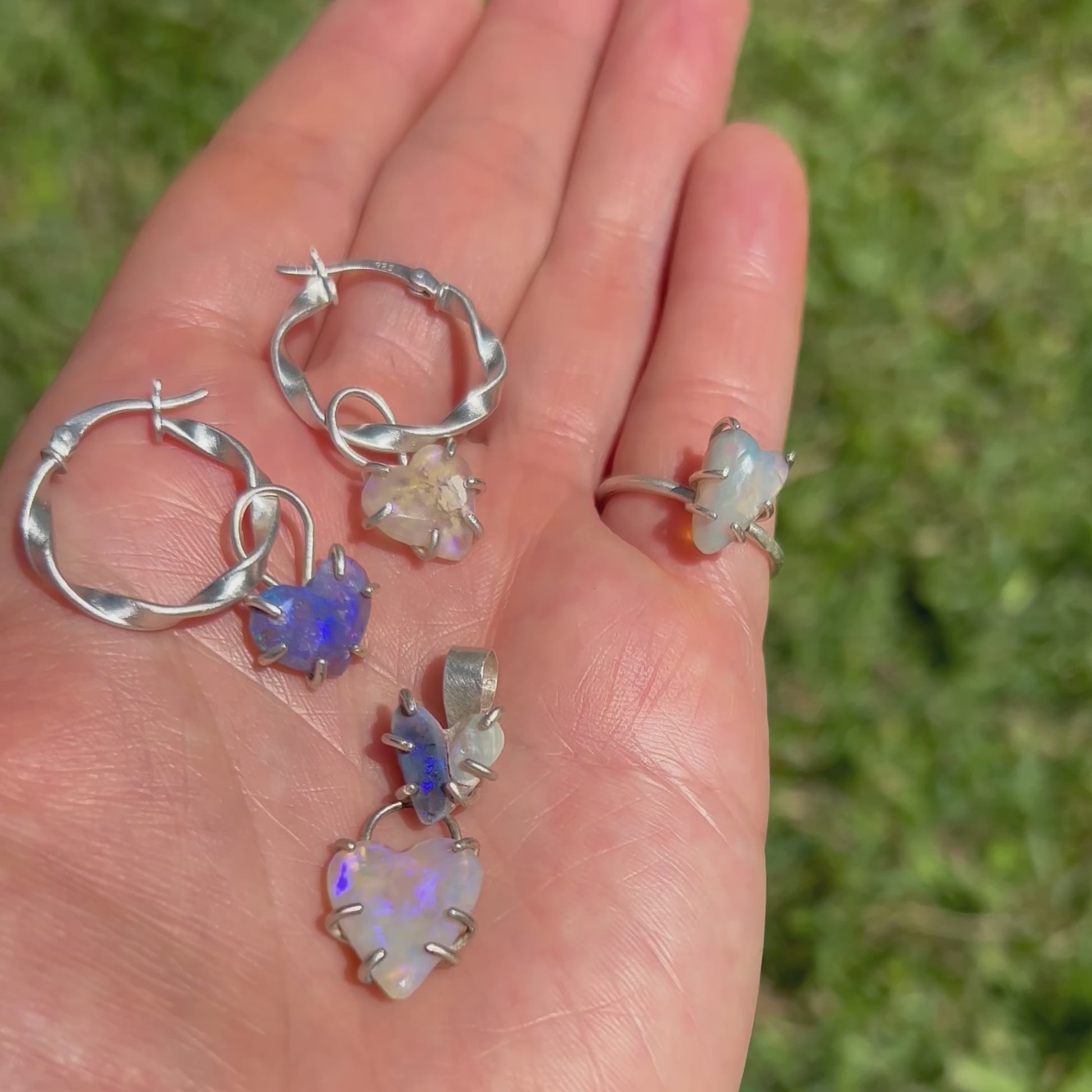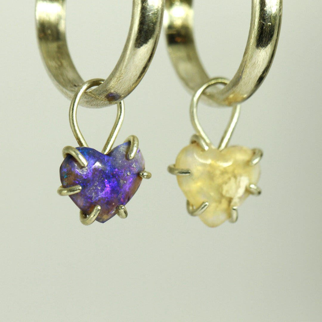 ✨👌🏾Hand cut and polished Lightning Ridge 💜Purple and 🤍White Crystal opals make up a pair of 💟Purple & White Love at First Sight hearts earring charms💟✨💍 Set on specially handcrafted pronged charm settings made uniquely for the pair.