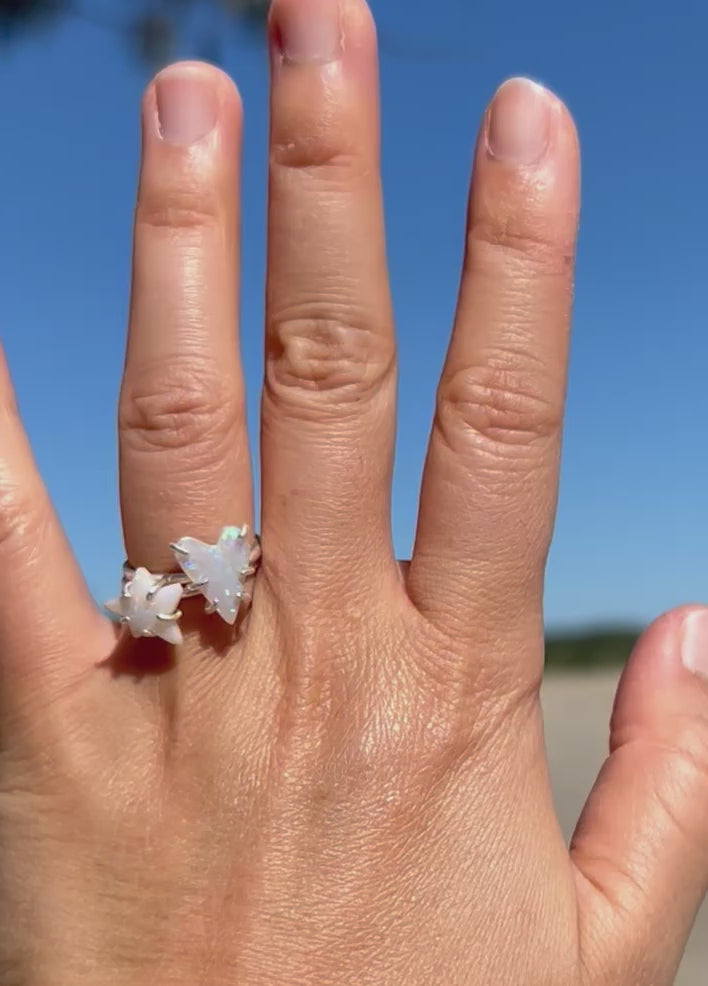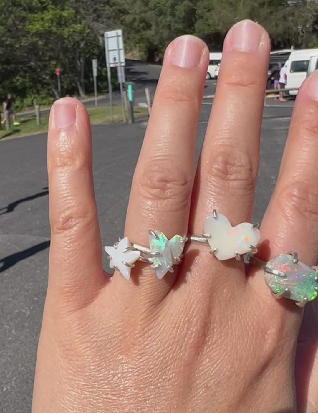 Hand cut, shaped and polished Lightning Ridge crystal opal into the shape of a love heart. Set by hand on a sterling silver pronged ring band made specially for this sweetheart. 💝